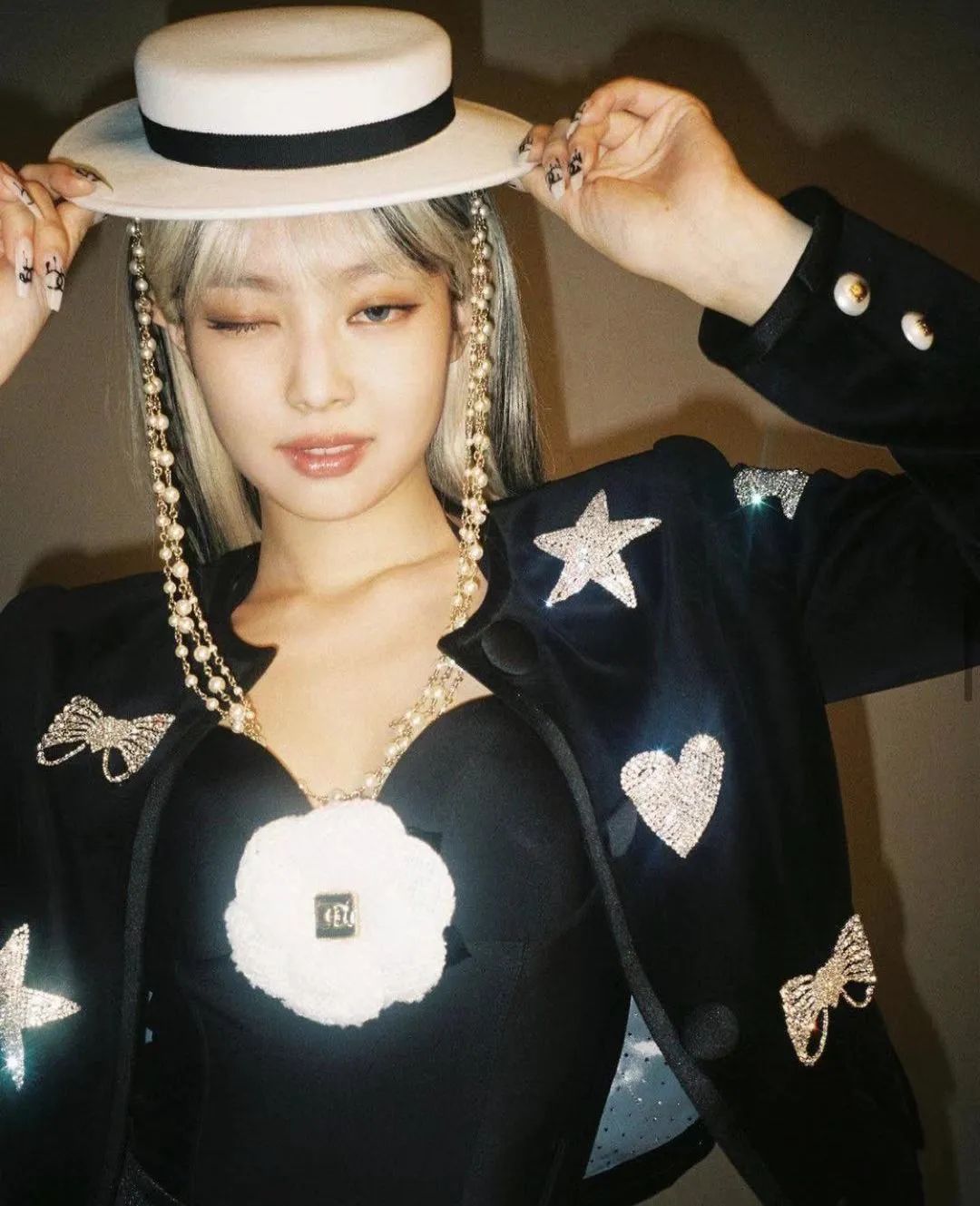 拿圆脸美少女Jennie来说,她标志性的嘟嘟圆脸就丝毫没有限制她的风格,因为她的饰品搭配得很巧妙,弱化她脸颊的肉肉感。
