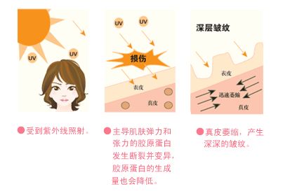而超过了时间,皮肤在没有防护之下持续受到阳光的暴晒,将会造成皮肤老化现象,如皱纹、老年斑、皮肤松弛,甚至皮肤癌。
