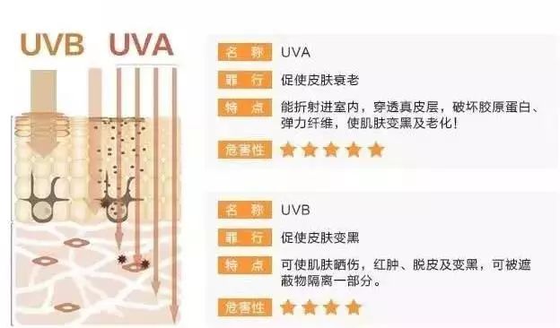 UVA会导致皮肤晒黑、失去弹性、形成皱纹,是破坏皮肤胶原蛋白,加快皮肤老化的重要原因。